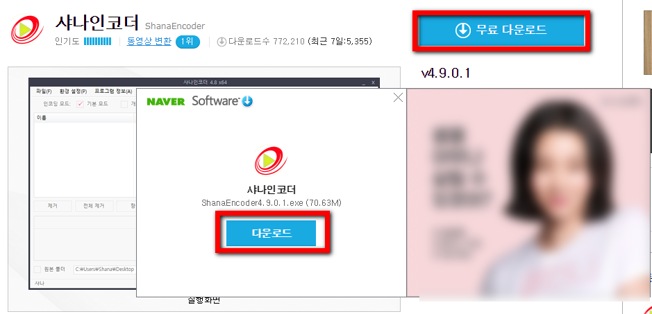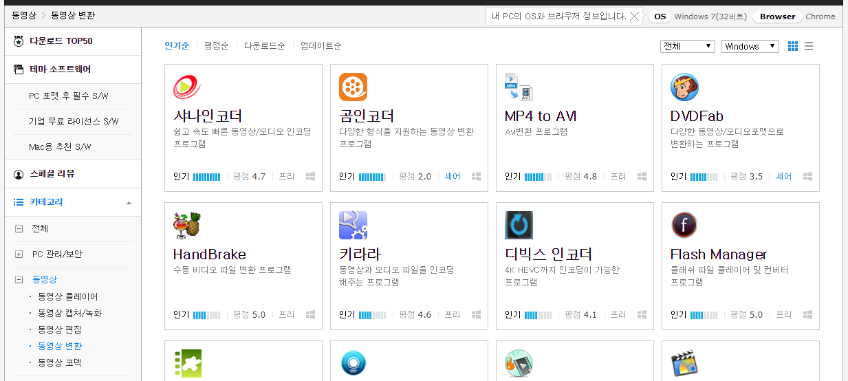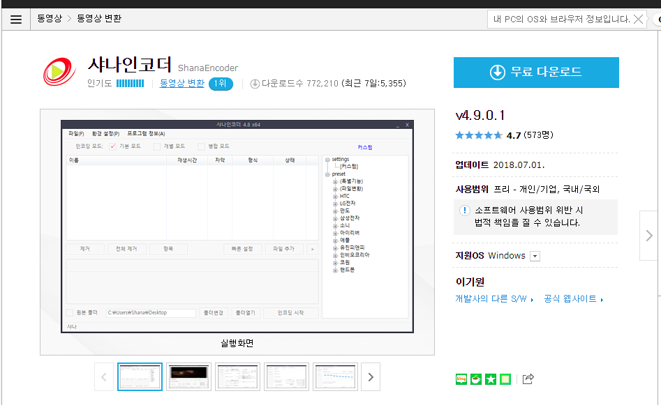 현재 카테고리에서 동영상->동영상 변환을 선택하시면 수많은 인코딩 프로그램이 나타납니다. 처음 등장하는 화면에 나오는 순서가 인기순이라고 하는데요. 이것을 참고해서 유용한 프로그램을 찾으시면 됩니다. 우리가 오늘 찾아보고 있는 샤나인코더 다운로드는 해당 카테고리 1위이군요.