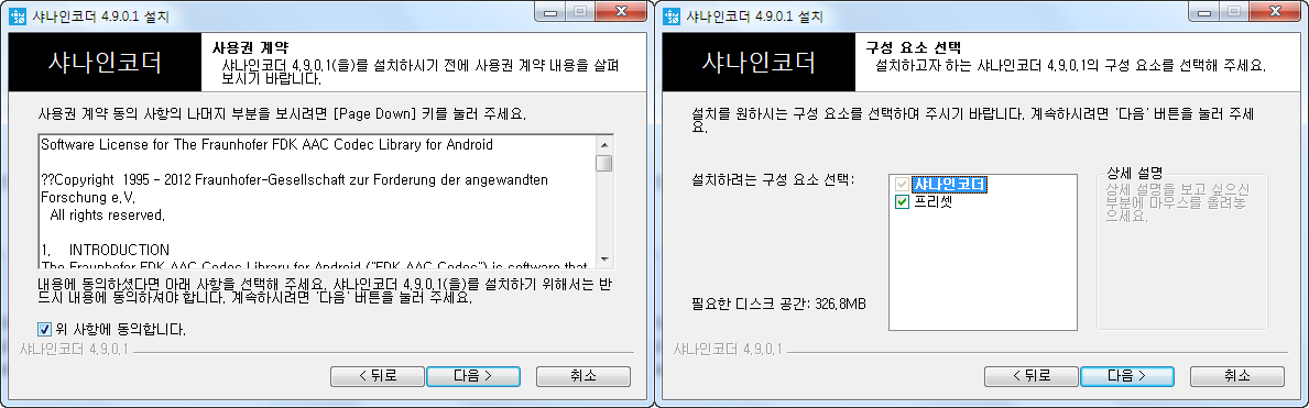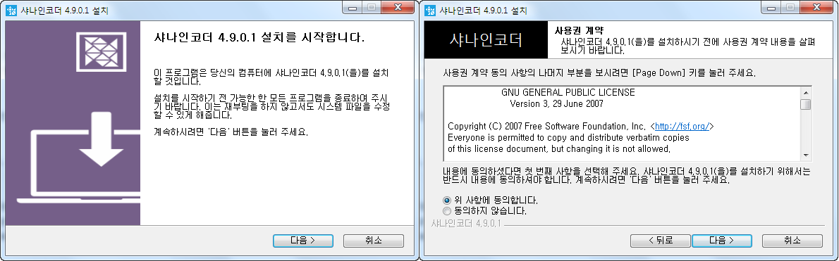 설치파일을 연다는 의미는 exe파일을 더블클릭한다거나 우클릭 후 열기를 선택한다는 뜻입니다. 잠시뒤 화면에는 설치를 안내하는 첫화면이 등장합니다. 당연히 다음을 선택하고 진행해야하는데요. 사용권계약은 샤나인코더를 사용하기 위해서는 무조건 동의해야하는 항목이니 참고하시고 "위 사항에 동의합니다" 선택이후 다음으로 진행하시면 됩니다.