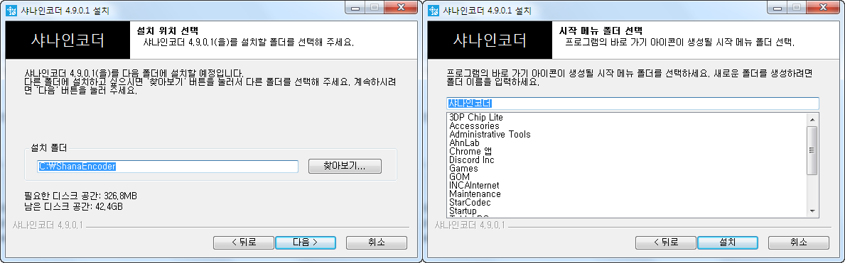 샤나인코더를 설치하고 싶은 경로를 지정하시고 다음과정으로 진행해주세요. 시작메뉴폴더도 굳이 변경하실필요는 없으니 그대로 두시고 설치버튼을 선택하시면 진행됩니다. 인스톨 과정주에 코덱 라이브러리를 다운로드 받아야하기때문에 다소 시간이 걸릴 수도 있으니 여유있게 기다려보시기 바랍니다.