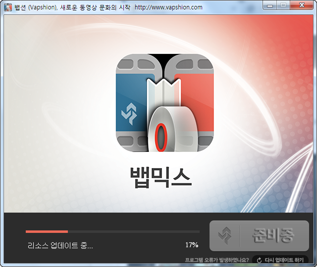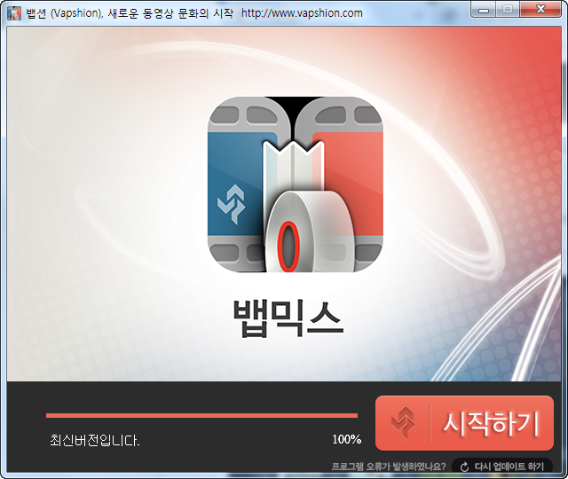 기본적인 사용을 위해서 리소스 업데이트가 진행되고 모든 과정이 100%까지 진행되면 시작하기 버튼이 활성화됩니다. 이제 모든 준비는 끝이났고 프로그램을 이용해서 편집을 진행해보시면 됩니다. 바탕화면에서 단축아이콘으로 뱁믹스를 실행시켜보세요.