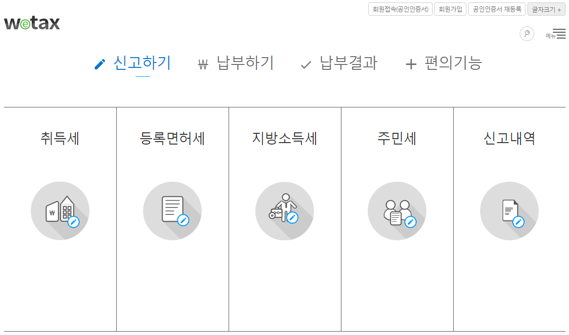 가장 일반적으로 사용할 수 있는 방법은 위택스 인터넷 홈페이지를 이용하는 것입니다. 뭔가 우리의 세금? 이런느낌의 이름을 사용하고 있는 이곳에서는 취득세, 지방소득세, 주민세 등등을 납부할 수 있도록 서비스 되고 있습니다.
