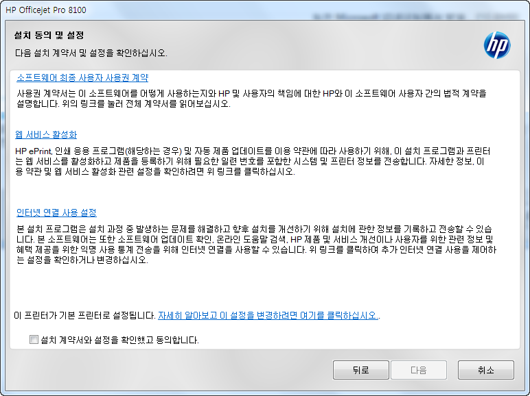 당연히 HP 프린터 드라이버를 정상적으로 설치하시기 위해서는 설치 계약서 및 설정 약관에 동의해주셔야 합니다. 이는 기본적인 절차로 만약 왼쪽 하단에 동의함을 체크하지 않을경우 인스톨을 시작조차 할 수 없답니다.