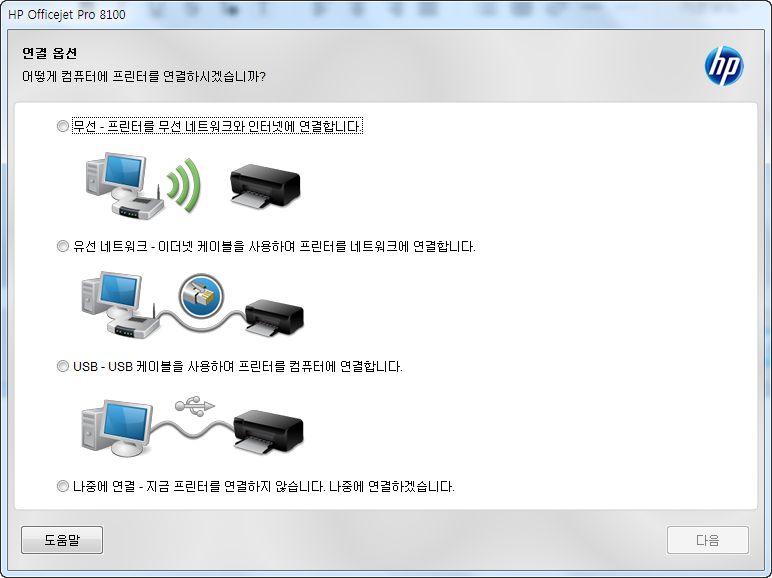 보통 hp 프린터 드라이버가 정상적으로 설치되었다면 연결 옵션 창이 등장하고 이곳에서는 프린터를 연결할것인지 확인하게 됩니다. 무선, 유선, USB등의 방식으로 연결된 프린터가 있다면 선택해서 정상적인 동작을 확인하시면 되는데요.