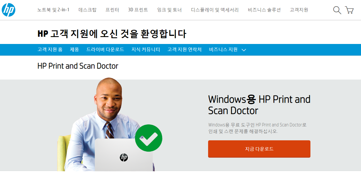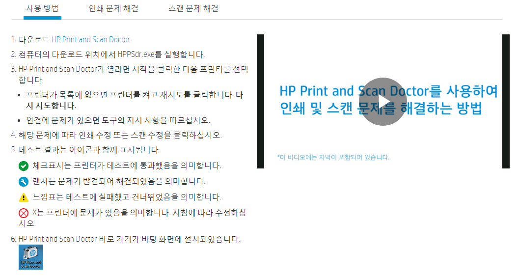 위에서 언급했듯이 정상적으로 hp 프린터 드라이버 다운로드 후 설치를 진행했음에도 스캔이나 인쇄가 되지 않을 수 있는데요. 그럴때는 HP Print and Scan Doctor 라는 프로그램을 받아서 사용해보셔야 합니다.