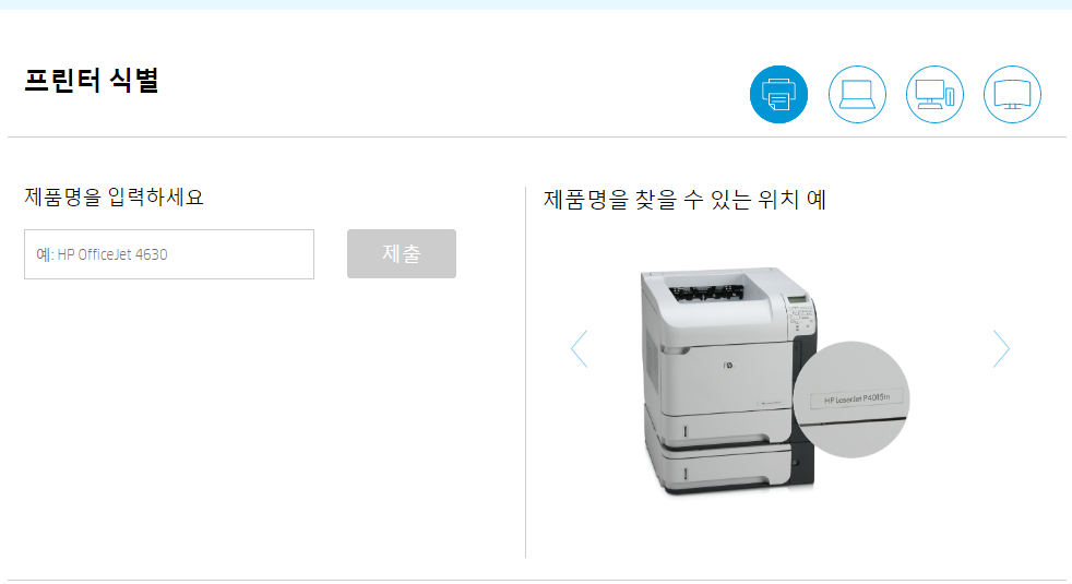 고객지원 -> 소프트웨어및 드라이버 다운로드 페이지에 연결되면 화면에서는 크게 4가지 아이콘이 표시됩니다. 대표적인 하드웨어가 보이는 것인데요. 프린터 / 노트북 / 데스크탑 / 기타 라는 메뉴중에서 우리는 가장 앞에 있는 프린터를 선택하면 되겠죠.