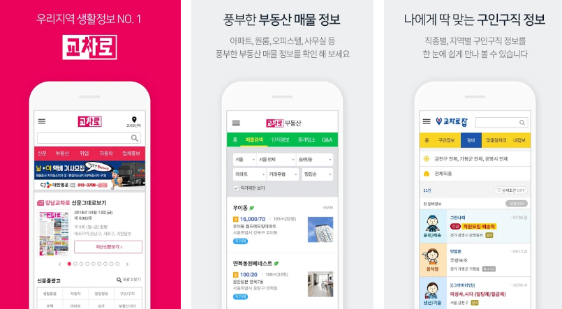 컴퓨터에서 사용하는것과 마찬가지로 교차로 신문그대로보기도 제공되고 있고 부동산 매물이나 구인구직 정보등도 스마트폰에서 바로 확인할 수 있습니다. 원하는 지역을 지정하고 찾아보시면 취업 / 업체 / 중고차 정보까지도 확인이 가능합니다.