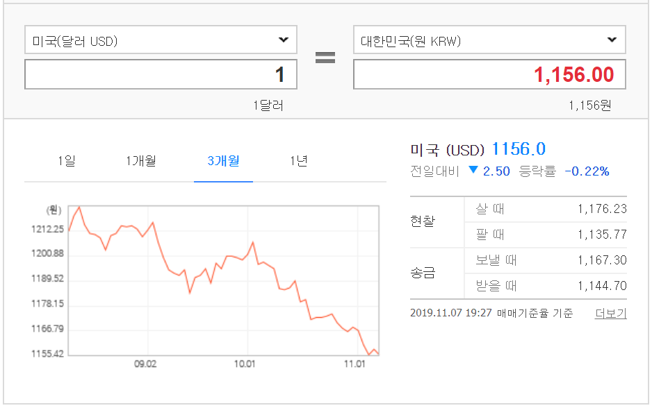 불과 10월초순까지만 해도 불투명한 미래때문인지 원달라 환율은 1200을 넘어서고 있었는데요. 현재일을 기준으로보면 1달라에 1156원에 거래되고 있습니다. 약 한달여 사이에 50원이나 떨어진건데요. 급등과 급락은 좋지않은것 같습니다. 적정선을 유지하면서 성장해주기를!