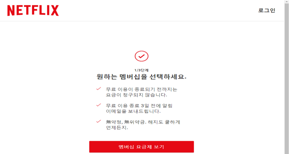 일단 정확한 넷플릭스의 요금제를 살펴보시기 위해서는 먼저 회원 가입부터 진행해주셔야 합니다. 뭐 아까 처음 화면에서 보셨겠찌만 30일 무료가 있으니 고민없이 진행해볼 수 있습니다. 화면을 보시면 멤버십요금제보기가 있죠.