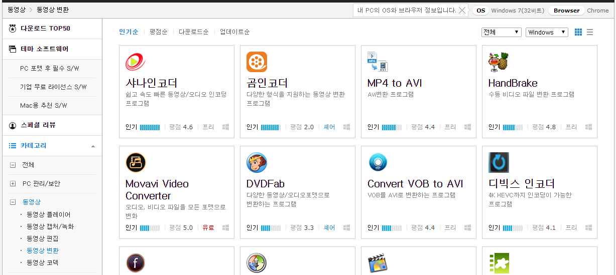 카테고리를 살펴보시면 동영상이라는 것이 보이실텐데요. 확장 버튼을 선택해보시면 동영상 변환이라는 것이 있습니다. 이것을 선택하시면 인기순으로 여러툴이 보입니다. 1위자리는 샤나인코더라는 것이 차지하고 있는데요.