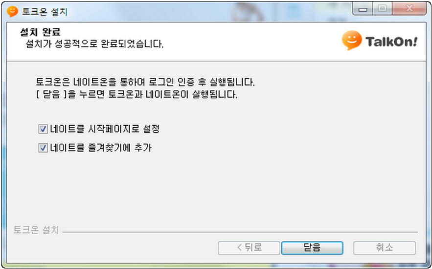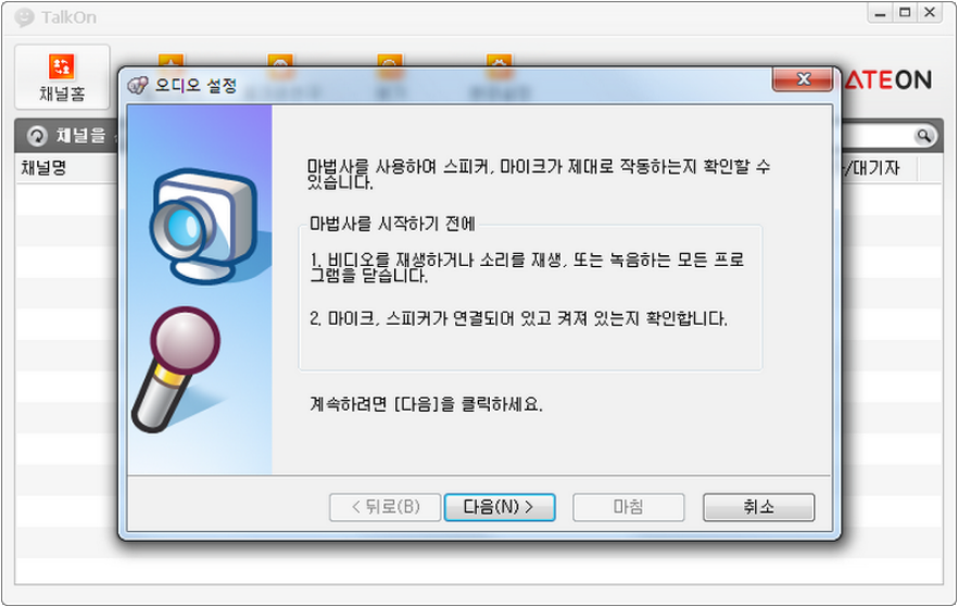 이것도 필요한 사람만 체크 표시를 남겨두시고 하단에 있는 닫음 버튼을 눌러주시면 인스톨 과정은 종료됩니다. 화면에 토크온이 실행되었다면 성공! 당연히 음성대화서비스 이기때문에 초기 실행때에는 마이크 설정이 시작됩니다.