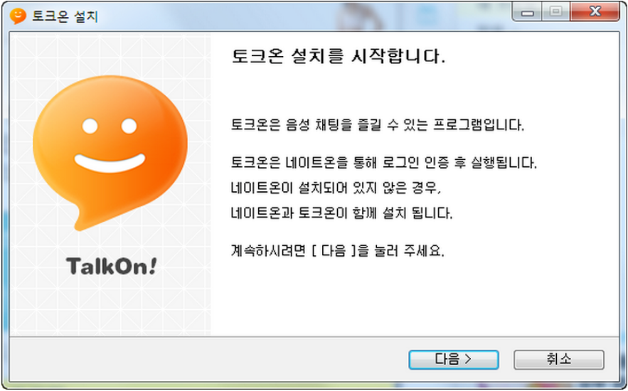이런식으로 토크온을 선택하시고 다운로드까지 진행되었다면 여러분들은 잠시뒤 화면에 설치안내를 알려주는 화면을 확인해 보실수 있습니다. 처음에 등장하는 단계에서는 별다른 내용이 없으니 다음을 선택하시고 진행시면 됩니다.
