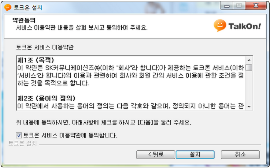 토크온도 네이트온과 마찬가지로 동일하게 기본적인 약관을 확인해주셔야 합니다. 일반적인 내용이지만 프로그램을 사용하시기 위해서는 당연히 왼쪽 하단에 있는 토크온 서비스 이용약관에 동의 합니다에 체크를 해주셔야 합니다.