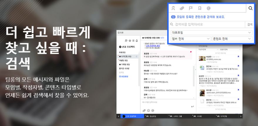 여러가지 자료가 들어있다고 해도 걱정하진 않아도 됩니다. 네이트온에서 팀룸이란곳에서 메시지와 파일등을 검색을 통해서 쉽게 찾을 수 있죠. 자신의 기억력을 믿지 못하는 분들에게는 정말 중요한 기능으로 약속이나 정보 확인용도로 사용하시기에 적합합니다.