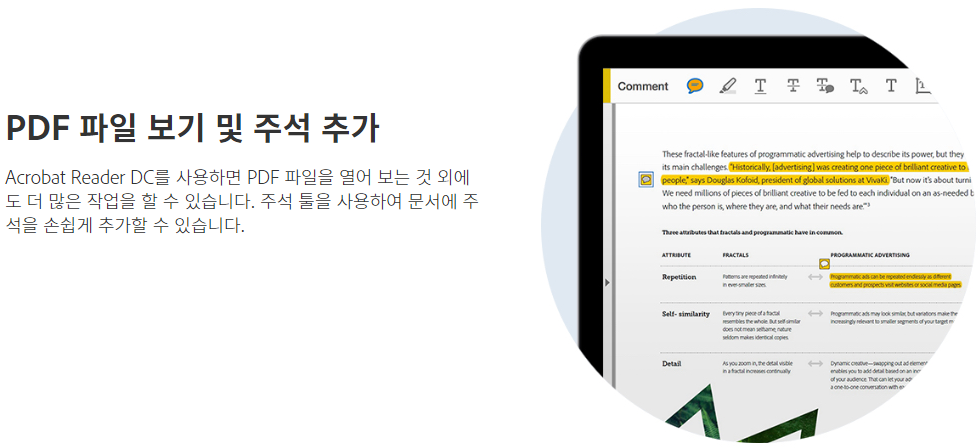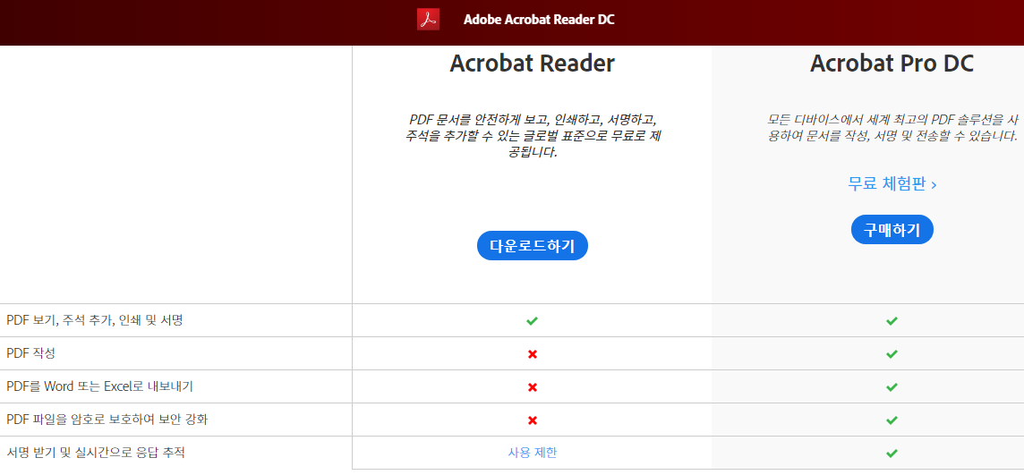 비용적으로 차이점이 분명하게 존재하지만 여러분들이 원하는 어도비 리더의 다운로드는 문서를 열람하는데 그 목적을 가지고 있습니다. 수정을 위한 도구가 아니기 때문에 그런 기능은 없는데요.