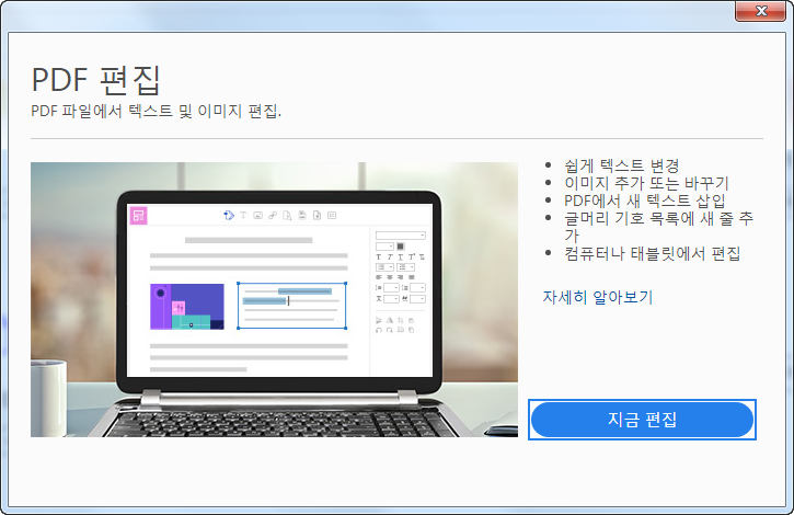 지금 편집을 선택해보시면 아까 말햇던 프로DC라는 것이 등장하게 됩니다. 돈을 주고 구매하시거나 체험판을 이용해야 한다는 것이죠. 필요없는 분들은 그냥 어도비 리더 다운로드 후에 사용해보시면 되겠습니다.