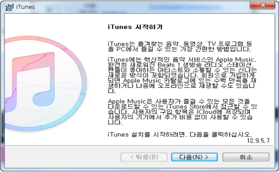 자 본격적인 인스톨 과정이 시작 되었습니다. 다시 말씀드리지만 아이튠즈라는것은 음악이나 동영상등의 여러가지 미디어 파일을 열어볼때 탁월한 기능을 발휘 합니다. 몇년전인가 등장한 애플 뮤직이라는 것과 함께 최근 더 인기를 누리고 있는것입니다. 첫화면에는 별다른 내용이 없어요.