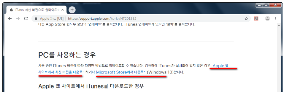 사이트를 살펴보게 되면 2가지로 나누어 져있다는 것을 알수 있습니다. 아이튠즈의 다운로드는 윈도우 용같은 경우 윈도우10버전에서 쓸수 있는것과 그외 버전을 쓰는 사람들이 쓸수 있는것으로 나누어져 있습니다. 마이크로소프트 스토어에서 필요한분은 받을수 있다는군요