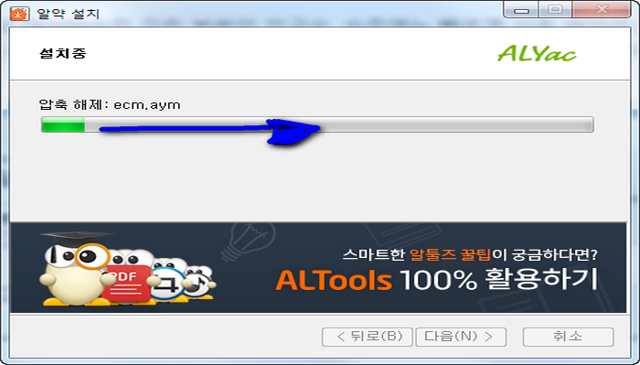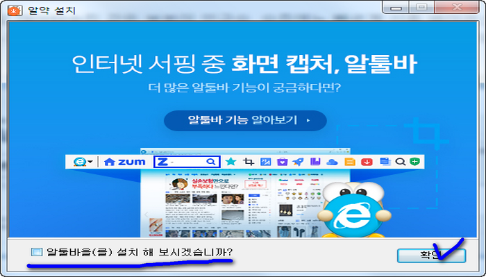 전체적으로 필요한 파일복사등과 관련된 작업이 종료되고 나면 끝이 난건데요. 마지막에 등장하는 알툴바는 우리가 원하는 부분이 아니니 당연히 하단부분에서 체크표시를 없앤후에 확인을 눌러야 합니다. 툴바는 익스플로러에서만 쓰는겁니다. 여기까지 알약 무료 다운로드 과정과 인스톨 설명입니다.