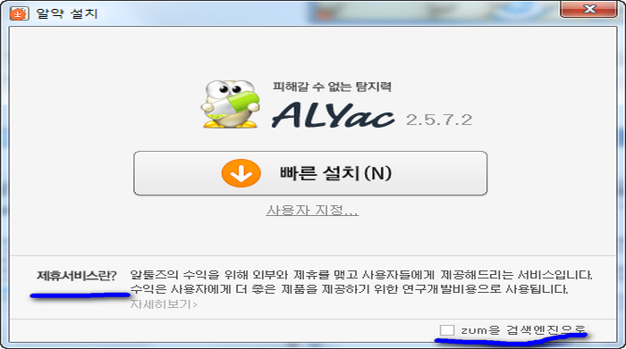 알약을 설치할때 조심해야 하는것이 무엇인지 물어보신다면 저는 제휴 서비스 항목이라고 말할것 같아요. 보통 자신이 원하지 않는 것들이 깔릴수 있는 부분이기떄문인데요. 알약 무료 다운로드에는 줌을 검색엔진으로 바꾸는게 있어서 원하지 않는다면 체크를 해제하는건 필수죠.