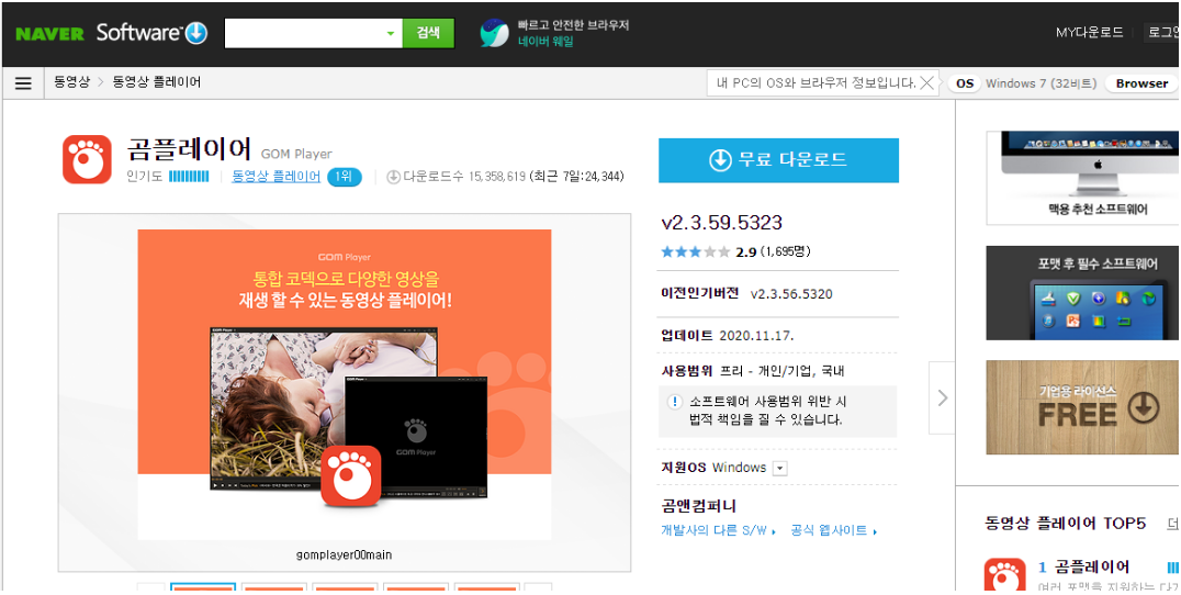 그럼 무료로 쓸수 있는 곰플레이어 다운로드는 어떨까요? 동일한 상단에 소프트웨어 부분에서 찾아보시면 플러스라는 글씨가 없는것이 있는데 그게 여러분들이 원하는 무료 버전이라고 생각하시면 됩니다. 당연히 위에서 언급한 기능의 차이는 있겠죠.부터 찾아서 이를 활용해보면 좋겠죠? 일단 페이지가 달라서 화면에서 보이는 내용도 유료와 무료버전은 달라요. 현재 제공되는 방법은 2가지로 오른쪽 부분에 보이실꺼에요.
