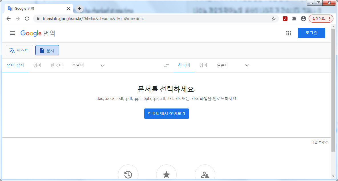 여러분들이 구글번역기에서 왼쪽위를 보시게 되면 문서라는 아이콘이 있는데요. 거기에서 본인이 소유하고 있는 문서파일을 컴퓨터에서 찾아서 등록해보시면 되는데요. 정확한 언어를 모르면 언어감지라는 부분을 선택해두시고 결과만 선택합시다.