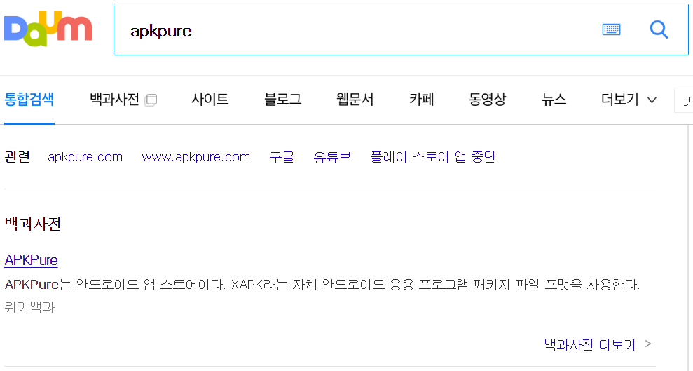 다음에서 apkpure라는 이름을 검색해보시면 한가지 웹사이트를 찾을수 있는데요. 여기가는 앱스토어라고 불리우는 해외사이트입니다. 공식 홈페이지 주소도 결과값이 같이 나오고 있으니 들어가보시기 바랍니다.