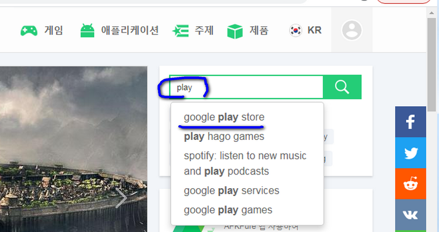 이제 플레이스토어를 찾아서 다운로드만 받으면 되는데요. 여기는 한글을 지원하기는 하지만 어플을 찾을때는 영문으로 입력하시는 것이 좋습니다. 영어로 play만 넣어보시면 자동완성에 우리가 원하는 것이 나오기 때문에 이를 선택해주시면 됩니다.