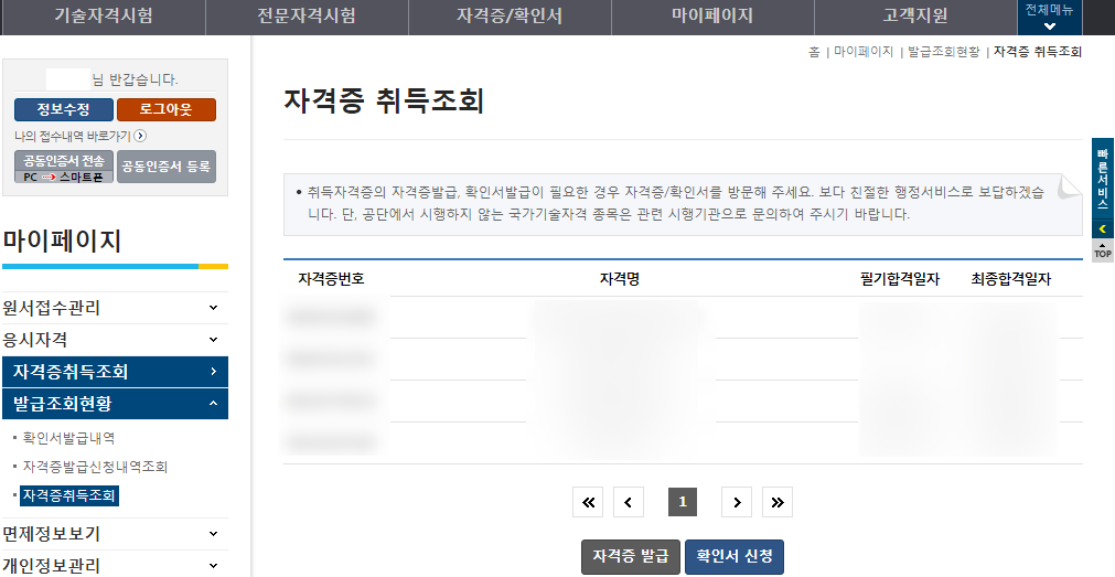 이력서를 쓰다보면 이런 것을 입력해야하는 항목이 있는데 언제 합격해서 받았는지 등을 확인할때는 발급 조회현황을 통해서 확인해보시면 됩니다. 저는 4개정도 딴것 같은데 이제는 사람들이 관심없어 하는 것들도 있군요. 그래도 뭔가 열심히 했던것 같아서 뿌뜻하긴 합니다.