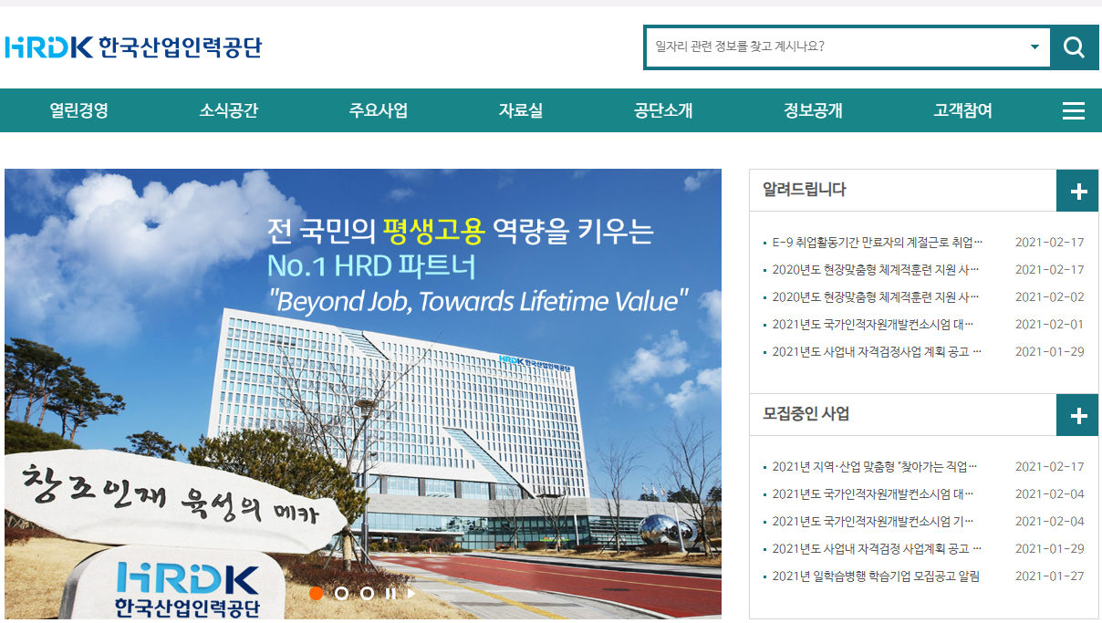 온라인에서 쉽게 들어가볼수 있는 한국산업인력공단 홈페이지에서는 들어서자마자 눈에 들어오는 문구가 있습니다. 창조인재 육성의 메카라는 이미지 위에 전국민이 평생고용의 역량을 키우는데 도움을 주겠다는 내용은데요. 옛날에는 평균수명이 80세였다면 이제는 100세를 바라보고있어요.