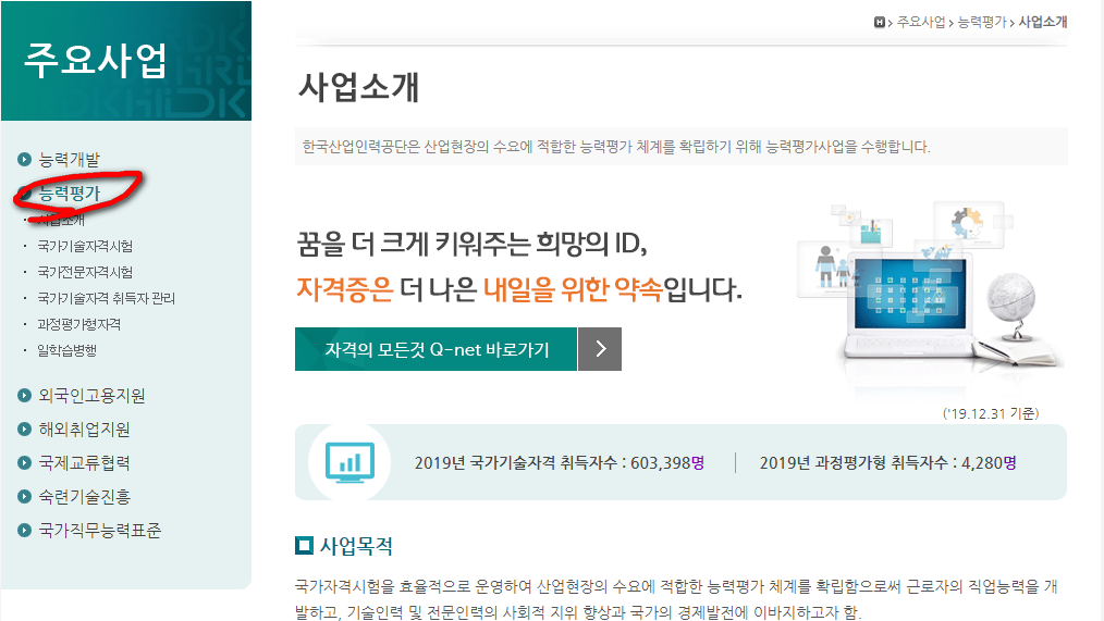 홈페이지에서 보시면 아시겠지만 주요 사업부분에서 능력평가라는게 들어있는데 거기에 설명을 읽어보시면 사업의 목적인 국가자격시험을 효율적으로 운영하기 위함이라고 써있죠. 맞습니다. 우리가 말하는 Q-net의 정체는 자격증시험을 볼때 필요한 곳이랍니다. 가운데를 보면 큐넷 홈페이지 바로가기 항목이 있으니 가봅시다.