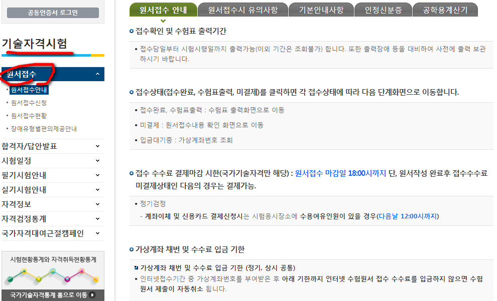 기술자격시험을 보려면 어떻게 해야하는지 알아보죠. 상단 메뉴를 통해서 원서접수안내를 읽어보시면 되는데요. 대부분 마감일 18시까지는 해야하는것 같군요. 당연히 가상계좌를 사용할수도 있는데 기간안에 입금을 안하면 취소된다고 하니 주의하셔야 겠죠.