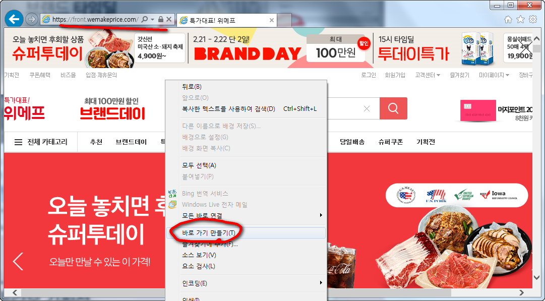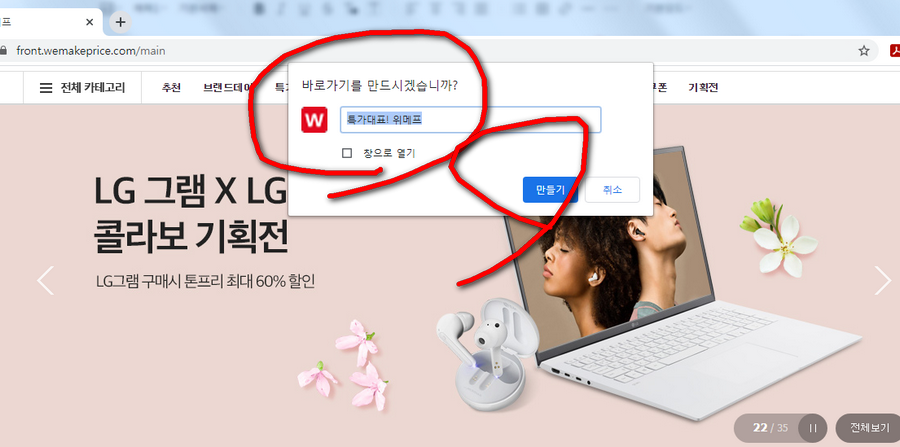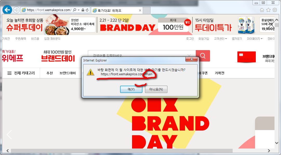 이것을 눌러주시면 윈도우 바탕화면에 사이트아이콘을 만들것인지 물어보는데요. 위메프 쇼핑몰 URL주소 가장 뒤에 있는 것이 main이라고 되어 있어야 첫페이지가 저장되어지게 됩니다.
