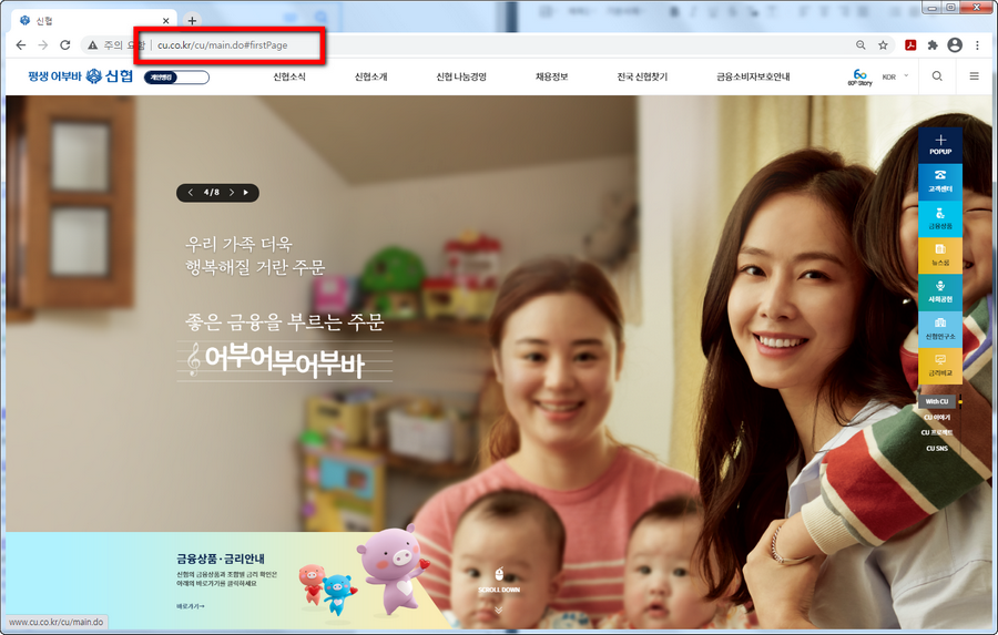 신협 인터넷뱅킹 바로가기는 다음과 같은 곳에서 검색만하시면 알수 있는데 이름이 편의점 명칭처럼 보여서 조금 당황하기는 했습니다. 처음 접속된 홈페이지를 보니 아까 말한 수많은 배우들이 촬영한 모습이 메인에 있는데 뭔가 정겹군요. 사이트에서 왼쪽 위를 보시면 개인뱅킹이라는 문구가 보입니다.