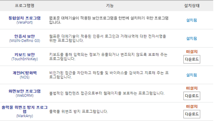 기존에 다른 금융권 사이트를 사용해보셨던 분들이라면 이미 저와같이 몇몇 소프트웨어는 이미 깔려 있을수 있습니다. 제가 생각했던것 보다는 뭔가 종류가 많은데 필수적인것인지 확인이 안되니 그냥 다 인스톨했습니다.