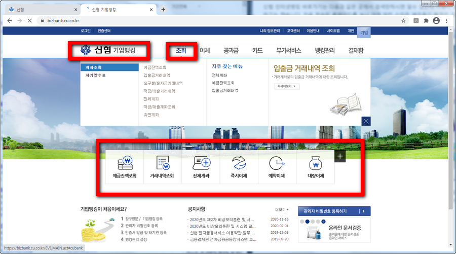 이를 선택하시면 여러분들이 개인이라면 쓸수 있는 신협 인터넷뱅킹 홈페이지가 나오게 되는데요. 만약 기업 사용자분들이라면 오른쪽 위에 있는 로그인/ 인증센터 옆쪽에 있는 "기업" 항목을 선택해서 사용을 진행하시면 되겠습니다. 몇몇분들은 이게 왜 나눠져 있는지 물어보시는데 하는 역할이 틀려서 그렇답니다.