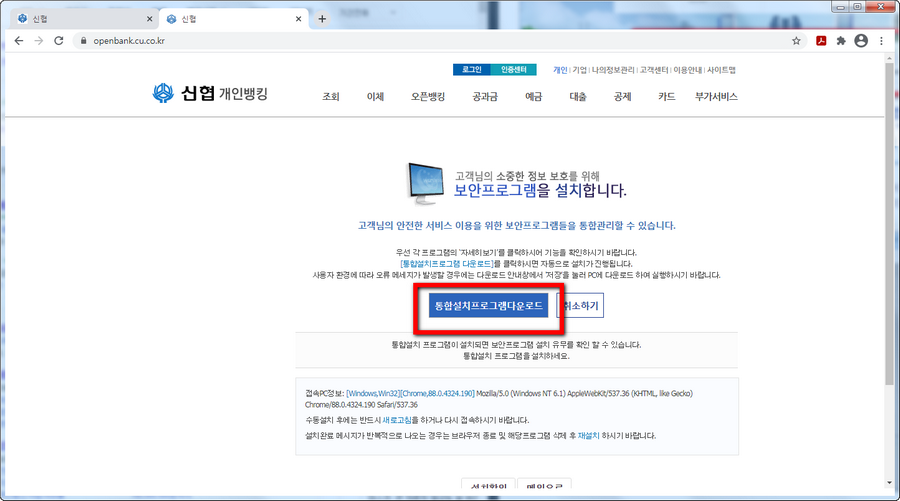다른대랑 조금 차이가 있는데 여기 신협에서는 통합설치프로그램 다운로드만 있습니다. 선택적으로 뭘 골라야하는지를 알수 없고 이걸 받아서 깔게되면 보안 프로그램 설치 유무를 확인하고 진행한다고 하더군요. 어쩌면 이게 컴퓨터를 잘 못다루는 이들을 위한 최선의 방법일수 잇겠져.