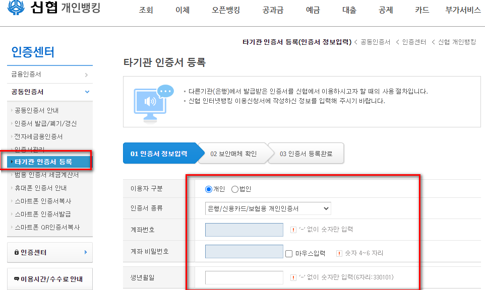 발급 신청을 하시고 신협 공인인증센터 바로가길로 들어가시면 기본적인 서비스 이용약관이 등장합니다. 당연히 동의하심을 체크하고 이용자 구분, 인증서 종류, 게좌번호, 등등의 정보를 입력후 신규로 발급을 받으시면 됩니다. 근데 이전에 다른 은행에서 쓰던게 있는분들은 이거 말고 타기관 인증서 등록을 쓰시기 바랍니다.