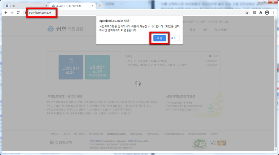 급여이체등이 포함되어 있어서 그런것일수도 있기는 합니다. 기본적인 사용을 위해서는 로그인을 해야만 하는데여. 개인이든 기업이든 이부분은 동일합니다. 로그인을 선택하시면 보안프로그램을 즉시 설치할것인지 물어보는 화면이 등장하게됩니다. 필수라서 사실 선택의 여지는 없어요.