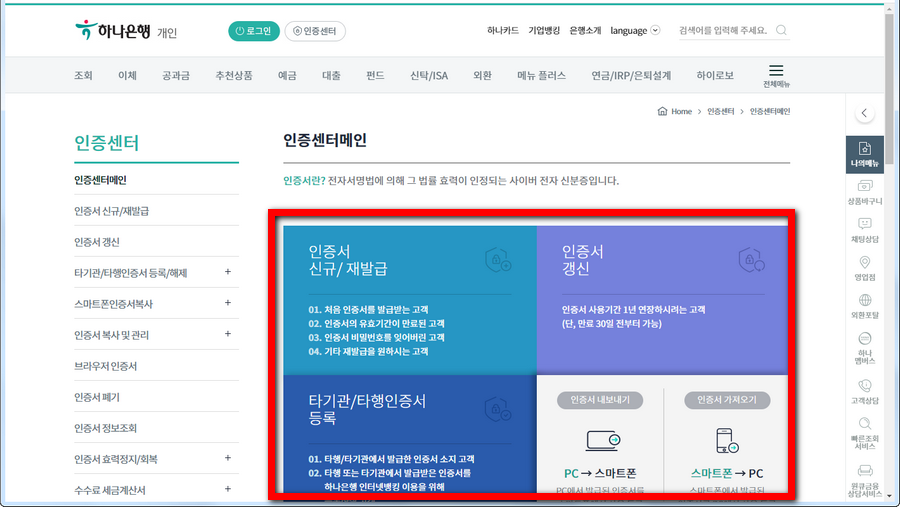개인이 쓸수 있는 하나은행 인터넷뱅킹 메뉴는 오른쪽 상단에서 전체보기로 볼수 있습니다. 이를 통해서 원하는 항목을 찾아서 쓰면 되고 일단 먼저 해야하는 것은 로그인입니다. 인증서를 통해서 들어갈수 있고 아이디를 통해서 로그인을 진행하시거나 하시면 됩니다.