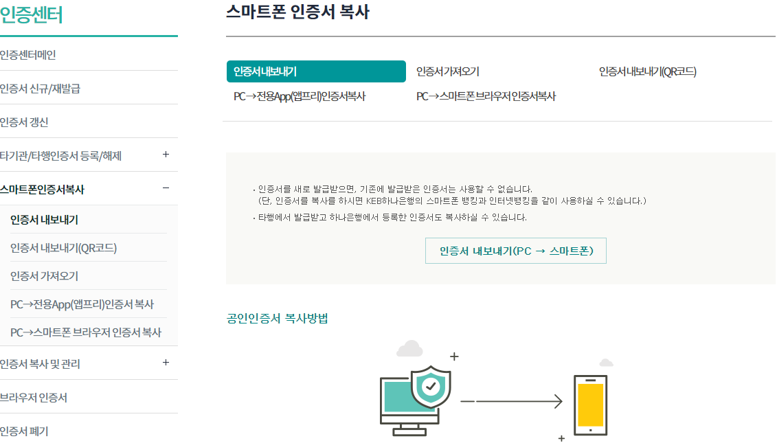 방법을 읽어보시면 알수 있지만 인증센터에서 인증서 내보내기를 실행하고 스마트폰에서 이를 받으면 됩니다. 그 중간에 인증코드를 가져와서 입력하는것이 있으니 컴퓨터와 폰이 동시에 준비되었을때 진행하시기 바래요. 보안센터에서는 피싱이나 파밍의 불안감을 떨쳐주기위해서 몇가지 서비스를 제공하니 읽어보시구요.