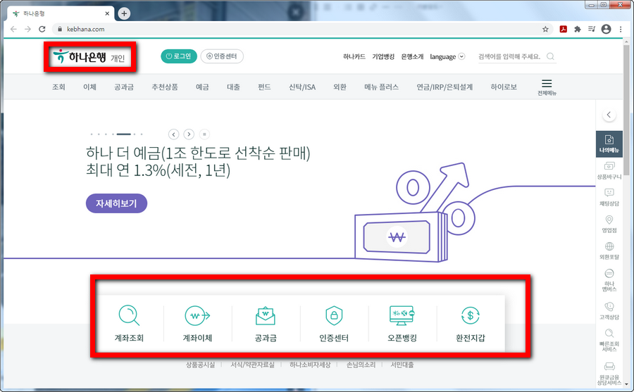 다음에서 검색해보니 빠르게 하나은행 홈페이지에 접속할수 있었는데요. 따로 인터넷뱅킹 페이지를 찾아볼 필요도 없는데 접속된 화면 자체가 그거에요. 굳이 이동할 필요없이 하단부분을 보시면 계좌를 조회, 이체, 공과금, 인증센터 등이 보입니다.