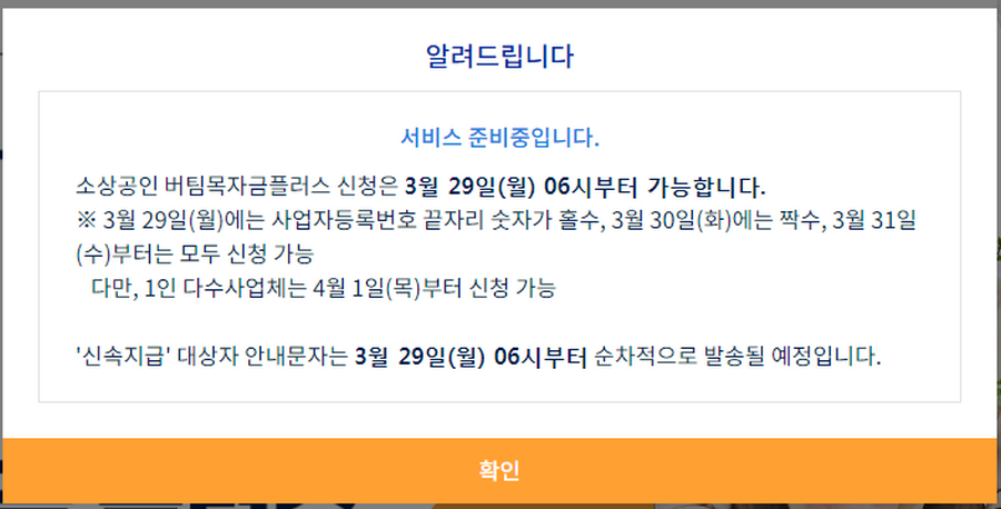 소상공인을 대상으로 진행되는 이것은 2021년 3월 29일 월요일 오전 6시 부터 접수가 가능합니다. 단 현재 글을 작성하는 시간에는 아직 오픈되어져 있지 않아서 사용이 불가능한데요. 가장 중요한건 이전과 마찬가지로 29일 월요일에는 사업자 등록번호의 끝자리가 홀수(1, 3, 5, 7, 9)이신분들만 가능하고 짝수는 30일부터입니다.
