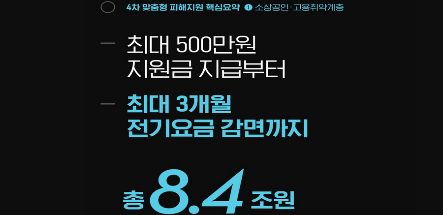 일단 이번 4차 맞춤형 피해지원에 대해서 살짝 살펴보면 최대로 받을수 있는 업종의 경우에는 500만원이 나온다고 하는데요. 이건 조건에 따라서 차이가 있기때문에 잠시뒤에 다시 설명을 드릴께요. 추가적으로 최대3개월 전기요금 할인도 있기는 하더군요.