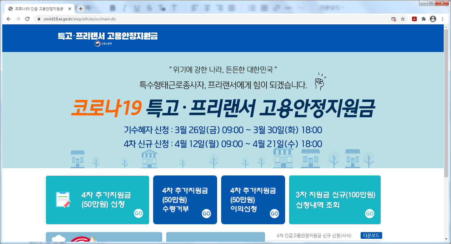 아까도 말씀 드렸지만 4차재난기금은 지원범위가 넓어졌습니다. 소상공인분들도 그렇지만 프피랜서나 법인택시기사, 돌봄서비스 종사자, 전세버스기사, 근로취약계층을 위해서도 지원금 지급이 예정되어져 있습니다. 단 신청 홈페이지는 차이가 있겠죠.