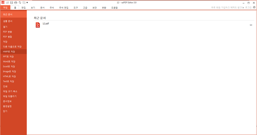 프로그램을 실행하시면 ezPDF 에디터의 화면 구성을 보실수 있는데요. 사용법은 간단한데 대상파일을 열기를 통해서 불러오시고 왼쪽 상단에 있는 파일이라는 항목을 선택하시면 여러가지 확장자로 변환도 시킬수 있고 병합도 가능합니다.