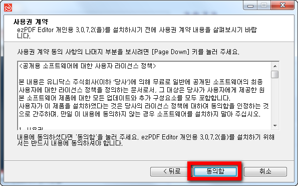 저장된 파일을 실행하시면 사용하시고 있는 컴퓨터에 프로그램을 인스톨하실수 있습니다. 웹브라우저에서 바로열기를 선택하시면 시작되는데요. 아까도 말했었던 사용권계약에서 공개용소프트웨어에 대한 사용자 라이선스정책이 등장합니다. 다시 말씀드리지만 ezPDF Editor 3.0 다운로드는 개인사용자가 비영리 목적으로 쓰는 경우만 해당합니다.