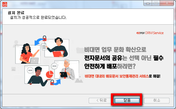 따로 구성요소를 선택하는 것은 없고 그냥 약관 동의함만 선택하시면 자동으로 설치가 되니 정말 편하더군요. ezpdf가 제대로 인스톨이 되어지고 나면 완료메시지가 나오는데 비대면 업무이야기가 나오는군요. 요즘은 코로나 때문에 이런서비스가 각광받고 있죠.
