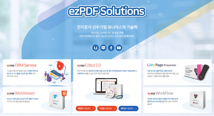 검색을 해봤더니 유니닥스라는 곳에서 해당 소프트웨어를 제공하고 있는것 같더라구요. ezPDF도 있지만 웹뷰어도 있고 워크플로어같이 기업에서 사용하는 것들이 많은데요. 거기에서 보니 화면 중앙에 ezPDF Editor3.0이 보이더군요.