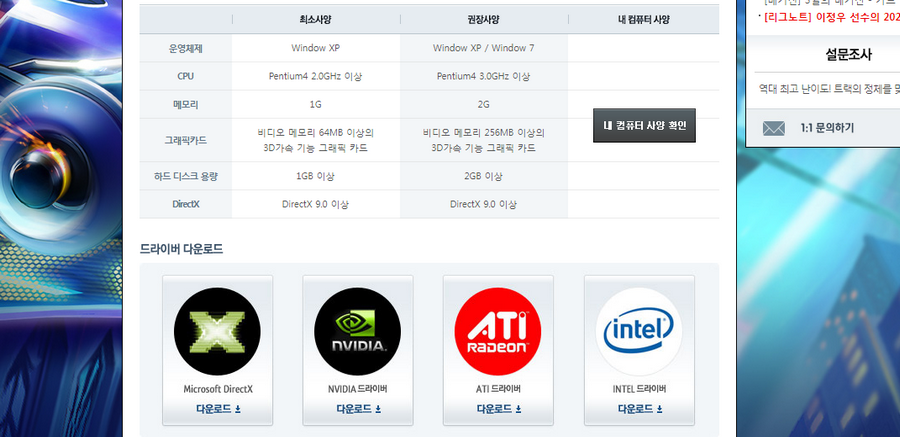 이 메뉴를 선택하시게 되면 카트라이더 클라이언트 다운로드를 받을수 있는 페이지로 이동할수 있게되는데요. 파일을 받기 전에 우선 어떤 컴퓨터 환경에서 사용할수 있게되어있는지를 찾아보시기 바랍니다.