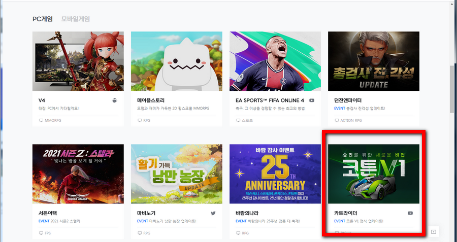 홈페이지에서 살펴보게되면 위쪽에서는 몇작품만 보일꺼에요. 중간부분으로 웹페이지를 이동해보시면 pc게임과 모바일이 나눠진 카테고리가 보입니다. 거기에서 카트라이더를 찾을수 있습니다.